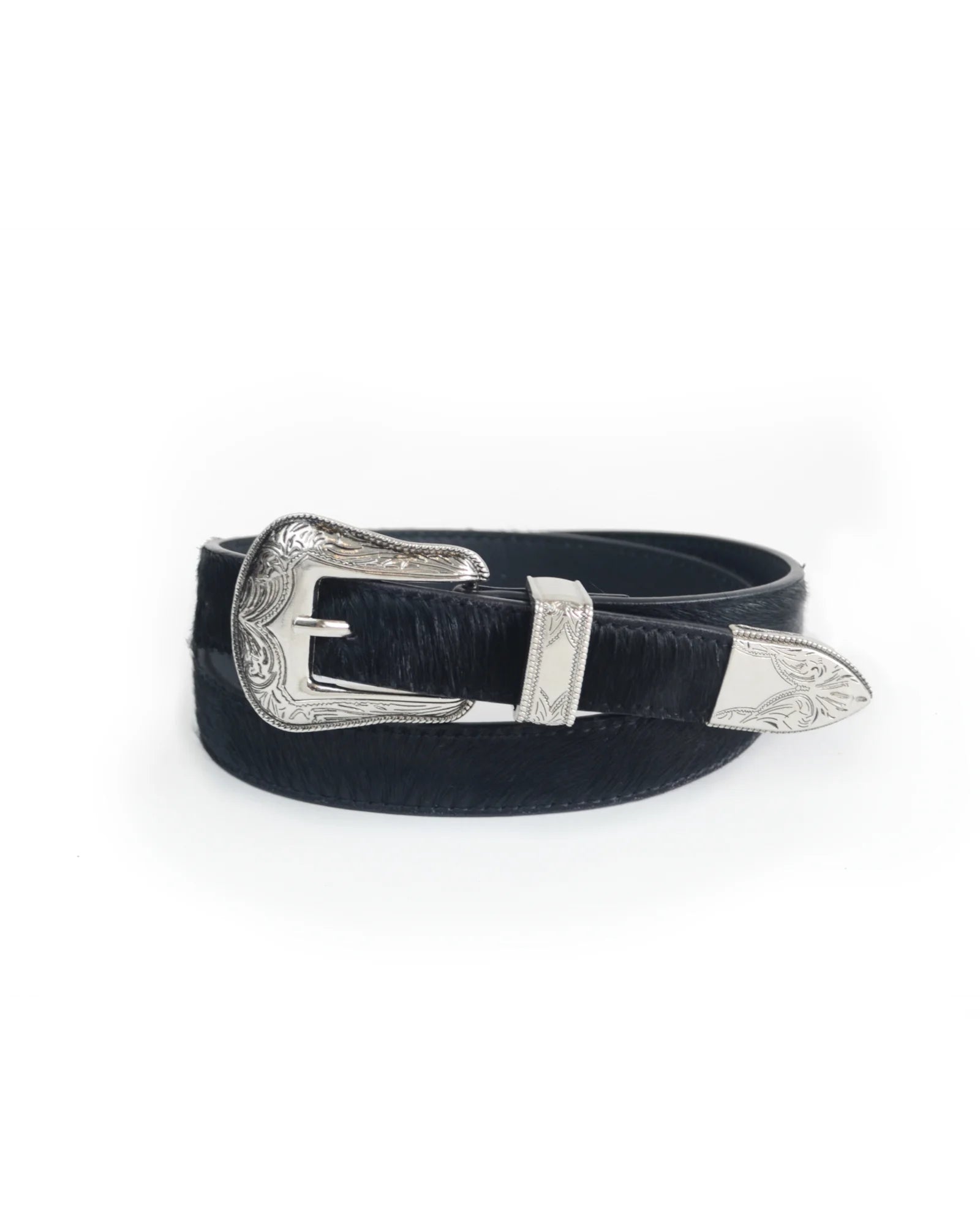 Ranger Western Belt in black pony hair. Made to quietly stand out. Crafted from genuine hair-on-hide cow leather, it features western design engraved metal buckle, keeper and end tip. The belt is 1 inch (2.5 cm) wide and designed to be longer than normal belts.